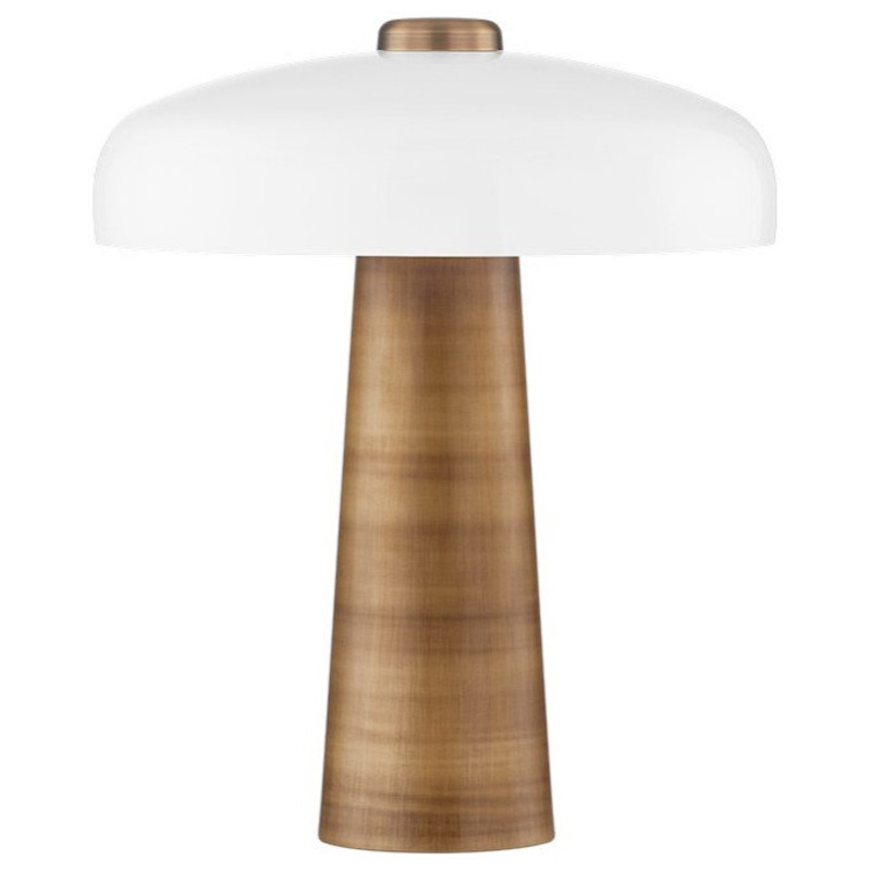 Lush takes the mushroom-shaped table lamp trend and makes it feel special using an unexpected mix of materials. An opal glossy glass shade caps a stem-shaped Patina Brass base. The glass shade gives the fixture a contemporary feel, while the metal finish a