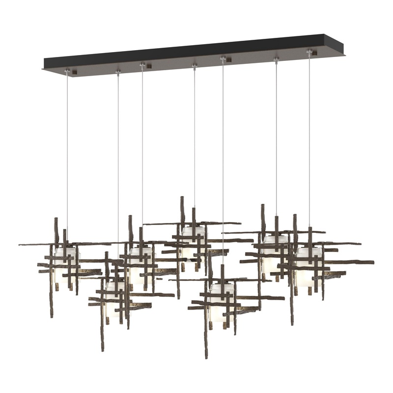 This 7-Light Tura with its rectangular canopy is a linear multi-port pendant, with both depth and dimension. Each intersecting piece is crafted from from annealed aluminum that are hand textured using a trip hammer and custom dies. This Tura Pendant’s shades are made of simple, thick cylinders of frosted glass. Available in all standard finishes.