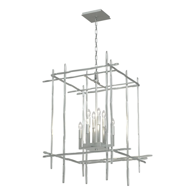 The Tura 8-Light Large Chandelier is the perfect focal piece for your dining room, foyer, great room or any living space. The chandelier has Candelabra bulbs and an intersecting perpendicular structure of individually hammered aluminum pieces that look like organic twigs from nature.