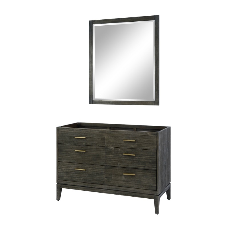 The Tyler Bath Vanity Collection from Le Bath is modern in design with unique metallic accents. The cabinet is raised on a tapered foot with metallic bar pulls on the storage drawers. This collection features Dark Pearl finish with wirebrushed texture. The overall result is a relaxed and modern collection that will complement today’s casual approach to interior bath designs. The Tyler Bath Vanity Collection from Le Bath has been designed to fit into today’s casually modern bath interiors. Drawing inspiration from mid-century bureau cabinet designs, the metal accents and wirebrushed finishes make the collection perfect for today’s bath interiors. Like all Le Bath vanities, the cabinets feature ample storage, matching portrait mirrors, and heirloom quality finishes. Vanity Only. Top not included. Faucet not included. Mirror not included.