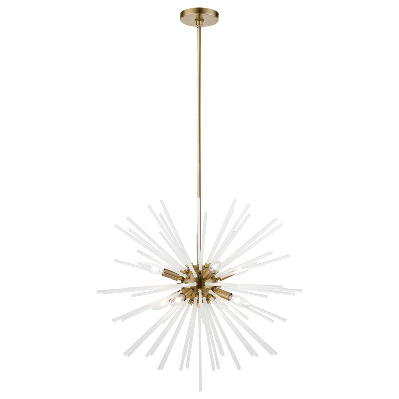 The Uptown eight light pendant chandelier will become an attention-grabbing feature in your modern home decor. The antique brass finish graces the design with elegance and charm, providing a traditional quality to the appearance. The acid etched rods gives the pendant chandelier a sleek and attractive style.