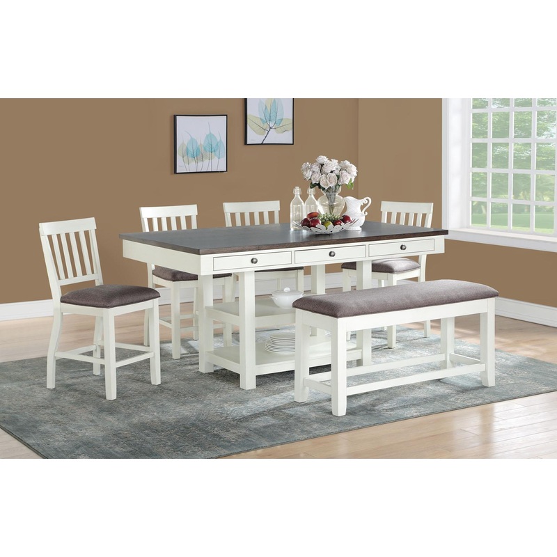 THIS IS A 6PC COUNTER HT TABLE SET THAT HAS 4 CHAIRS AND A BENCH WITH A FABRIC SEAT AND DRAWERS ON THE SIDE OF THE TABLE ITS A LIGHT CREME WITH DARK GRAY COLOR FOR MORE INFORMATION FEEL FREEL TO ASK ANY QUESTIONS