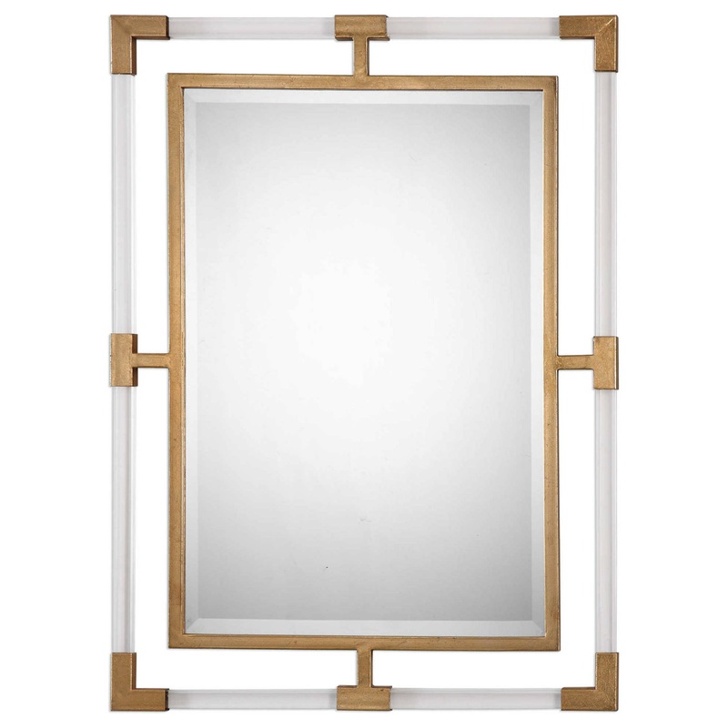 The Uttermost Balkan Mirror can certainly serve as a focal point for any room. Combining hand forged iron, finished in lightly antiqued gold leaf, with suspended solid, clear acrylic bars creates a modern feel. This Uttermost mirror has a generous 1 1/4 in
