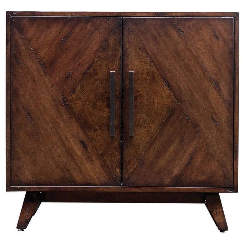 Mid Century Inspired Styling, With Geometrically Pieced Mango Veneer Doors Accented With An Ash Burl Veneer Center Finished In A Deep Mahogany Stain With Natural Distress Marks And Burnishing, Complete With Antique Brass Finished Bar Handles. Includes One Adjustable Interior Shelf.Uttermost’s Accent Furniture Combines Premium Quality Materials With Unique High-style Design.With The Advanced Product Engineering And Packaging Reinforcement, Uttermost Maintains Some Of The Lowest Damage Rates In The Industry. Each Product Is Designed, Manufactured And Packaged With Shipping In Mind.
