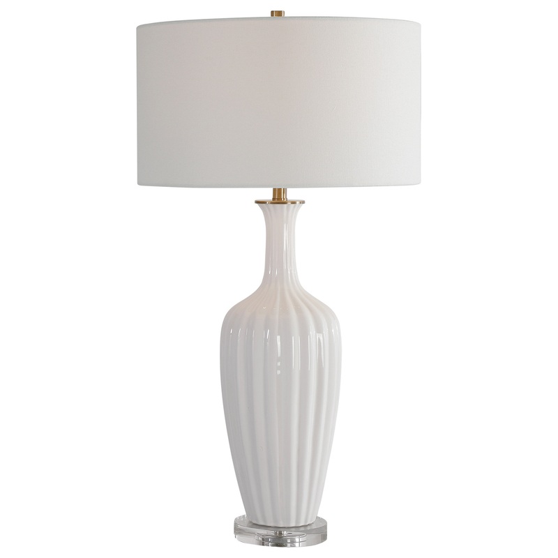 Uttermost’s Lamps Combine Premium Quality Materials With Unique High-style Design.With The Advanced Product Engineering And Packaging Reinforcement, Uttermost Maintains Some Of The Lowest Damage Rates In The Industry. Each Product Is Designed, Manufactured And Packaged With Shipping In Mind. Displaying A Traditional Elegance, This Table Lamp Features A Fluted Ceramic Base In A Gloss White Glaze With Brushed Brass Plated Details And A Thick Crystal Foot. A White Linen Fabric Drum Shade Complements The Piece.