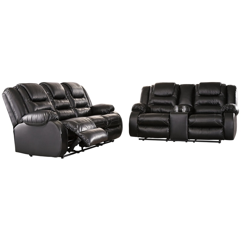 When it comes to comfort, style and value, this faux leather reclining sofa and reclining loveseat in black rocks. Tailored for feel-good flair, its fashion-forward bustle back design is enhanced with sculpted padding on the headrest for cradling support. Channel cushioning along the sides flows into thick, wrapped pillowtop armrests that are truly over the top. And while it might look like you broke the bank, a sumptuously soft leather-like fabric keeps indulgence well within budget.