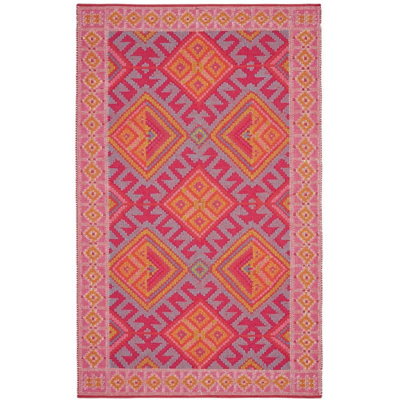 This traditional Kilim weave was borrowed from an antique swatch and interpreted in performance yarns in shades of orange, rose, turquoise, lime, tomato, and ochre. Stain- and weather-resistant , it was sustainably made from recycled water bottles using fa
