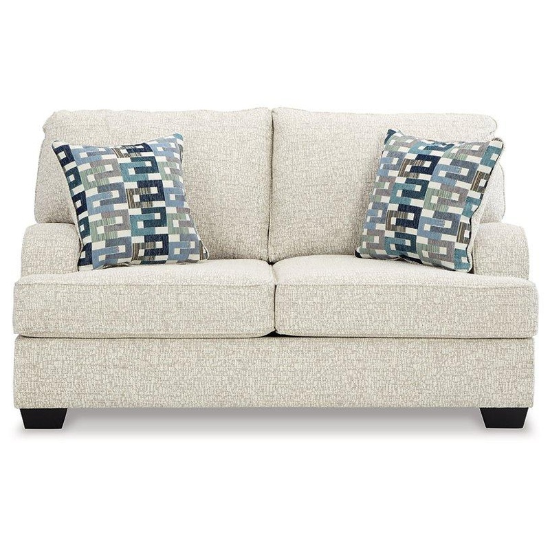 This loveseat has the corner on casual contemporary style and everyday comfort. Chic and subtly innovative, its crosshatched chenille upholstery is a forward-thinking take on fashionable neutrals. The sleek frame gets a soft, streamlined touch with sloping track arms. Eclectic accent pillows further appeal to your relaxed approach to modern flair.