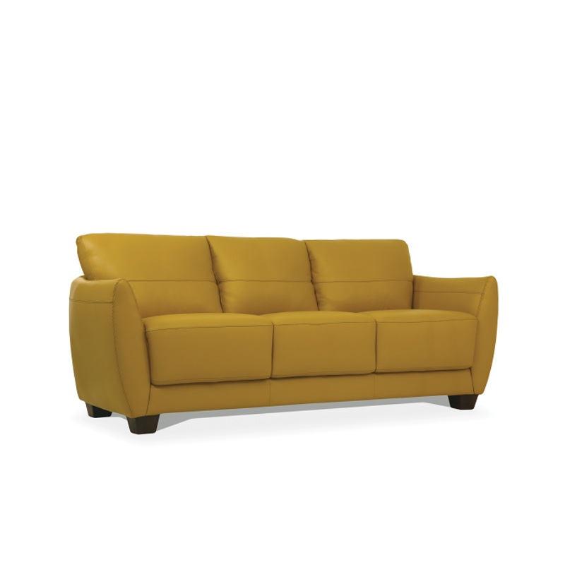 ACME Valeria Sofa, Mustard Leather, 79"L x 36"D x 31"H, 130lbs. The Valeria sofa set is one you-ll want to spend lots of time in. This beautiful mustard or watery leather sofa features same tone stitching and unique wood block legs. Its deep, comfy seat an
