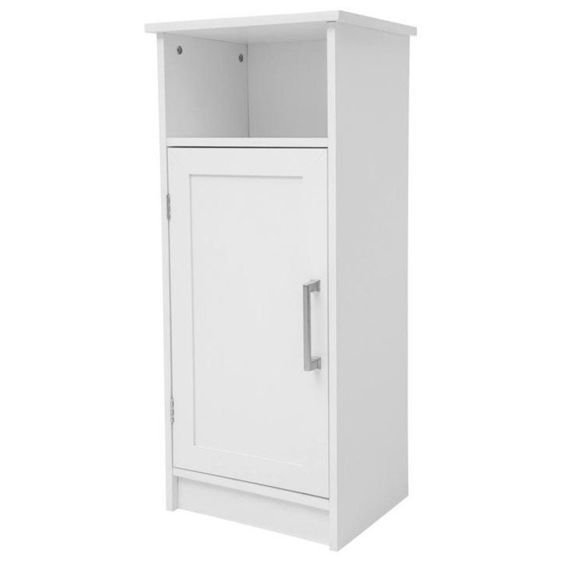 -Style and practicality align beautifully in this bathroom floor storage cabinet organizer. Maximize your capacity when you store your room’s essentials with this chic space saver. This is the perfect choice for small spaces and adapts to any room in your home. Make a statement by showing off this freestanding cabinet organizer built from premium materials, including sturdy engineered wood with premium metal hinges and door handle that will remind everyone that you take your dcor seriously. The fashionable, modern look boasts clean lines for a timeless design. Behind the cabinet door of this storage cabinet organizer is an adjustable shelf and the door features a magnetic closure so you can store your items with confidence. The addition of an upper open display shelf doubles as extra storage space or as the perfect display platform for your decor. Each shelf holds up to 55 lbs. static weight and the plastic foot pads on the bottom are engineered to protect your floors. Assembly is quick and easy, typically taking under 60 minutes and maintenance only requires a damp cloth. Organizing your space with flair and efficiency has never been easier.