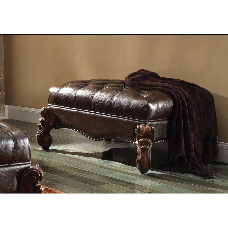 ACME Versailles Ottoman, 2-Tone Dark Brown PU & Cherry Oak, 37" x 28" x 20"H, 46Lbs. The Versailles Ottoman presents a hand-crafted piece inspired by the most luxurious designs of the past. The stunning PU upholstered ottoman comes in a cherry finish and f