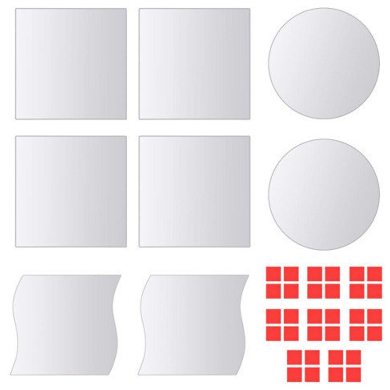 This set of frameless mirror tiles can be arranged in a variety of patterns of your choice. Adding mirrors to any living space will not only make a decorative statement, but also bring more light and a spacious effect to the room. These mirror tiles are made of high-quality glass which makes them relatively durable and highly reflective. The clean-cut, frameless design looks fantastic in any contemporary home and will enhance the brightness of the room and increase the sense of space. You can stick these mirror tiles to the wall by using the included stickers. Delivery includes 8 square mirror tiles, 4 oval mirror tiles, 4 S-shaped mirror tiles and 64 adhesive strips.
