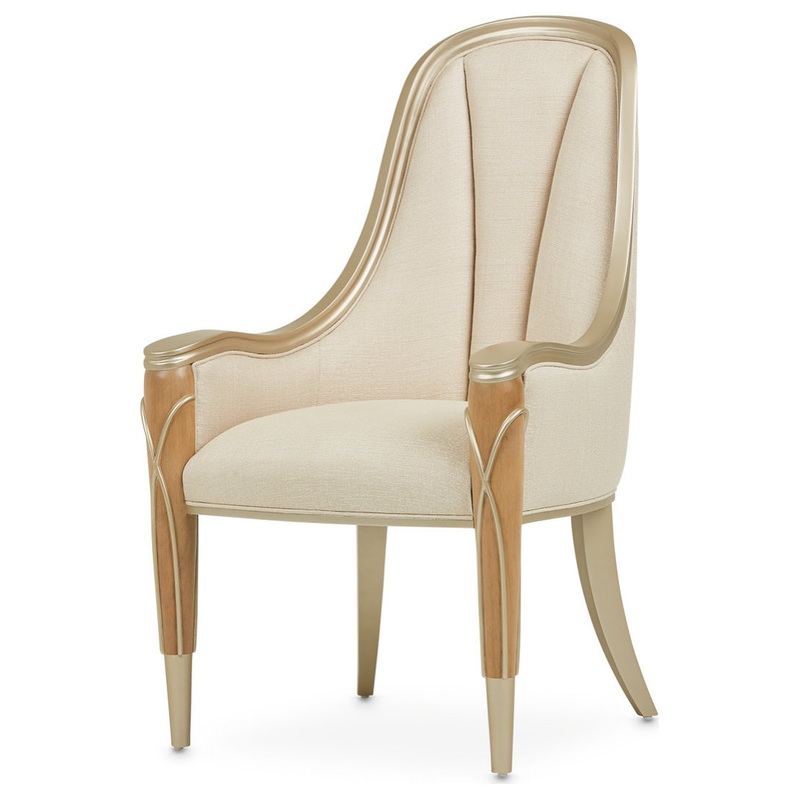 Every curve counts. The Villa Cherie Arm Chair's timeless style is defined by its sweeping lines and elegant shapes. Showcasing channel tufted upholstery and Chardonnay accents that give off a soft shine, this design is guaranteed to elevate luxury dining