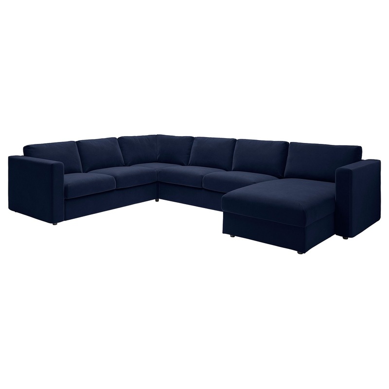 VIMLE corner sofa, 5-seat w chaise longue, Djuparp dark blue