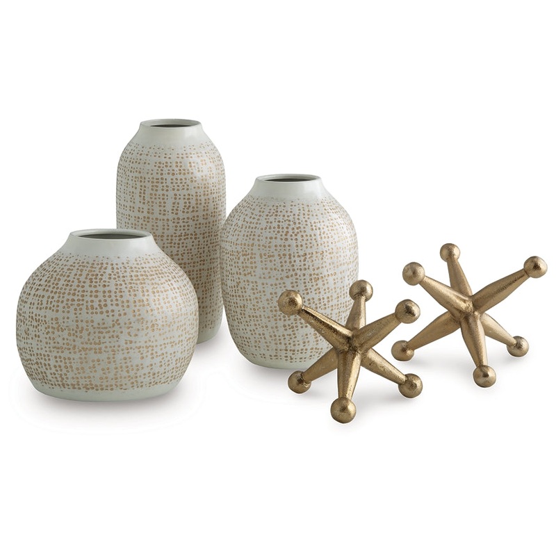 Elevate your decor with this striking accessory set. Its sleek white vases, adorned with delicate goldtone accents, are perfect for displaying your favorite faux blooms or standing alone as minimalist statements. They're paired with bold geometric sculptur