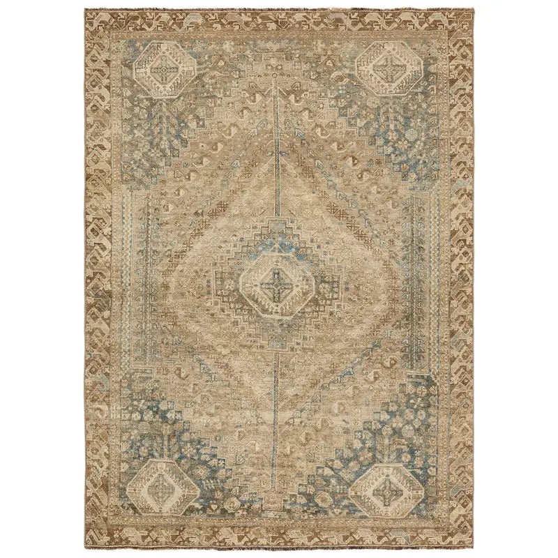 Elevate your decor with this hand-knotted 100% wool rug, featuring a timeless blend of brown, tan, and blue. Centered and quadrant medallions create a balanced yet dynamic look, while the vintage-inspired construction ensures durability and a patina that improves over time a true investment in style.