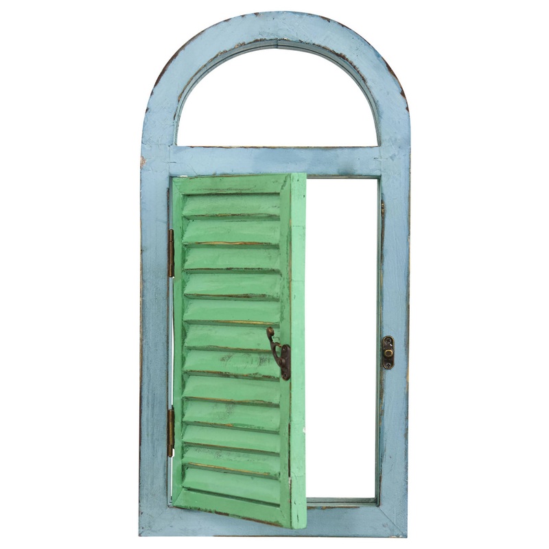 Complete a shabby chic living room or bathroom with an added pop of color. This window frame and shutter turned mirror is painted in bold cerulean and teal blues, then finished with a worn, weathered look to add a hint of vintage charm to your living space. Hang at the entryway to peek at before heading out the door, or use in a nursery for a charming, cottage accent.