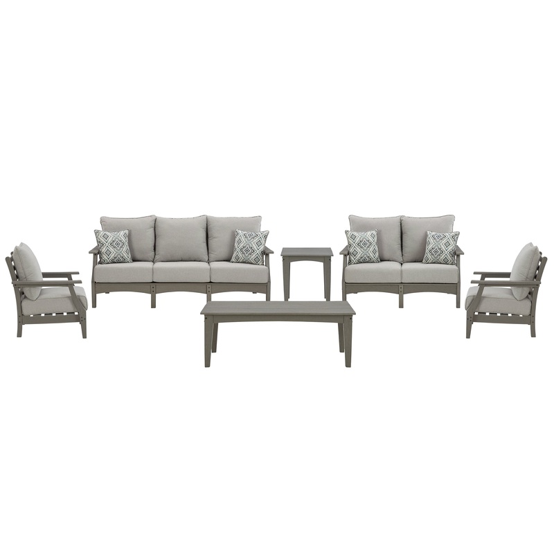Its the dawn of a new day for gray. Embrace the style trend with this outdoor set. Each piece is crafted of HDPE material, combining the exceptional durability and weather resistance you need with the wood look you love. The tables and comfortably cushioned seats take alfresco living to a whole new level. Slatted table tops infuse a plank-style, farmhouse-inspired touch and naturally shed rainwater. Rest assured, the thick cushions on the sofa, loveseat and lounge chairs are wrapped in Nuvella high-performance fabric thats fade-resistant, stain-resistant and a breeze to keep clean.
