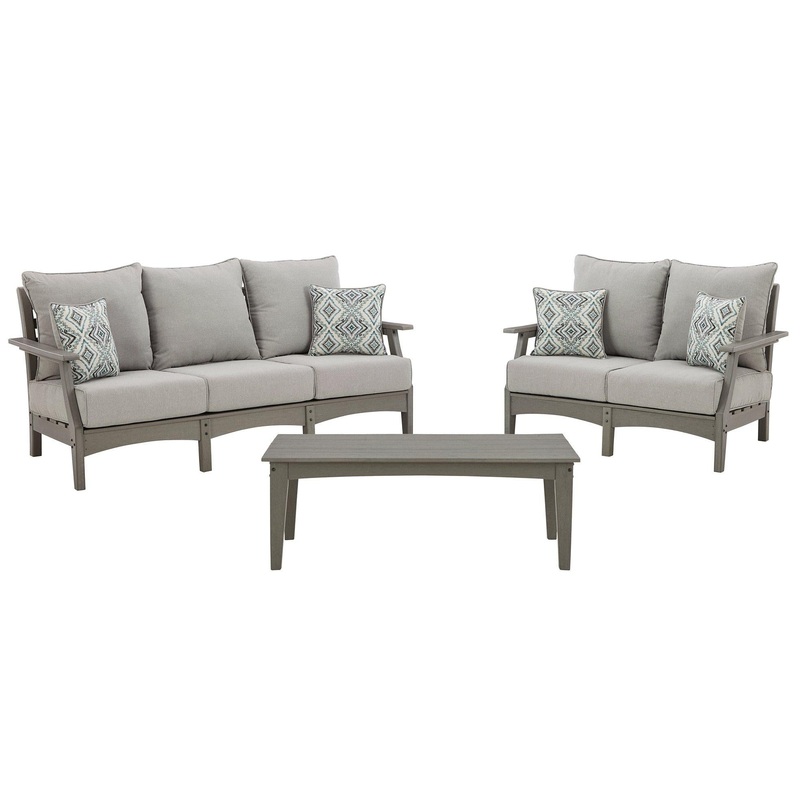 Its the dawn of a new day for gray. Embrace the style trend with this outdoor set. Each piece is crafted of HDPE material, combining the exceptional durability and weather resistance you need with the wood look you love. The coffee table and comfortably cushioned seats take alfresco living to a whole new level. A slatted table top infuses a plank-style, farmhouse-inspired touch and naturally sheds rainwater. Rest assured, the thick cushions on the sofa and loveseat are wrapped in Nuvella high-performance fabric thats fade-resistant, stain-resistant and a breeze to keep clean.