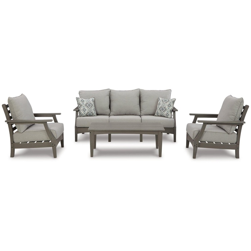 Its the dawn of a new day for gray. Embrace the style trend with this outdoor conversation set. Each piece is crafted of HDPE material, combining the exceptional durability and weather resistance you need with the wood look you love. The coffee table and comfortably cushioned seats take alfresco living to a whole new level. A slatted table top infuses a plank-style, farmhouse-inspired touch and naturally sheds rainwater. Rest assured, the thick cushions on the sofa and lounge chairs are wrapped in Nuvella high-performance fabric thats fade-resistant, stain-resistant and a breeze to keep clean.
