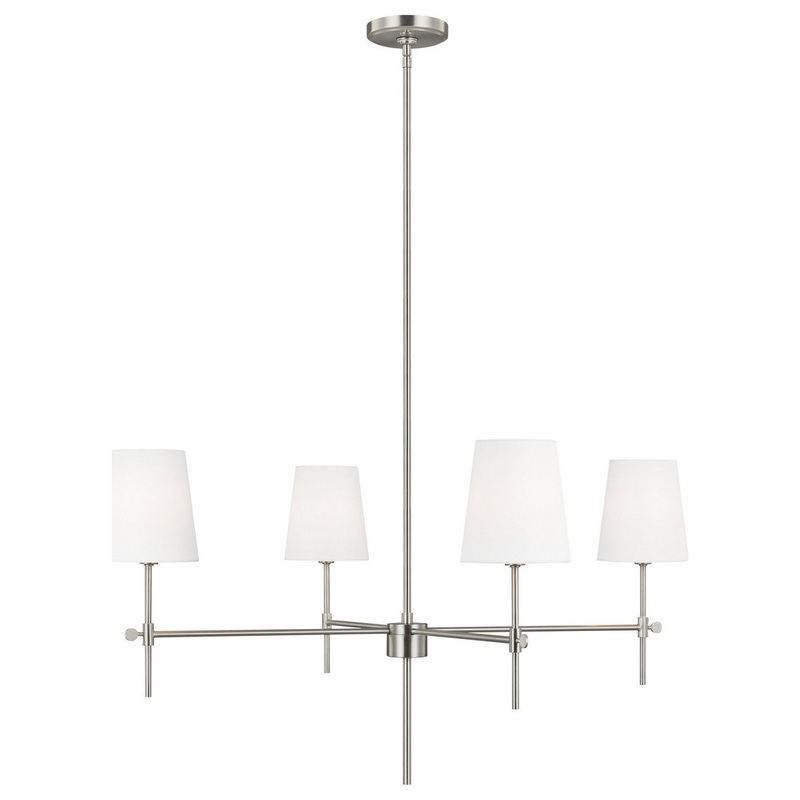 The Baker four light single tier chandelier in brushed nickel is the perfect way to achieve your desired fashion or functional needs in your home. A lantern-like design with curved arms connecting to a cube-shaped frame -Width: 36.00" -Height: 18.13" -Leng