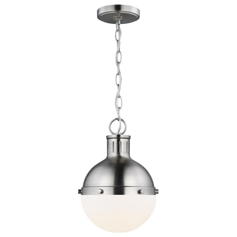 The Hanks medium modern pendant is offered in the Midnight Black/Satin Bronze, Antique Brushed Nickel, Satin Bronze, or Brushed Nickel finish. This globe style pendant is crafted with an antique finish and white glass shade, offering an approachable style