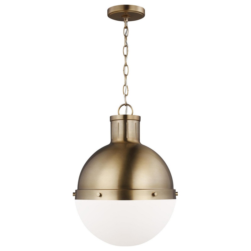 The Hanks medium modern pendant is offered in the Midnight Black/Satin Bronze, Antique Brushed Nickel, Satin Bronze, or Brushed Nickel finish. This globe style pendant is crafted with an antique finish and white glass shade, offering an approachable style