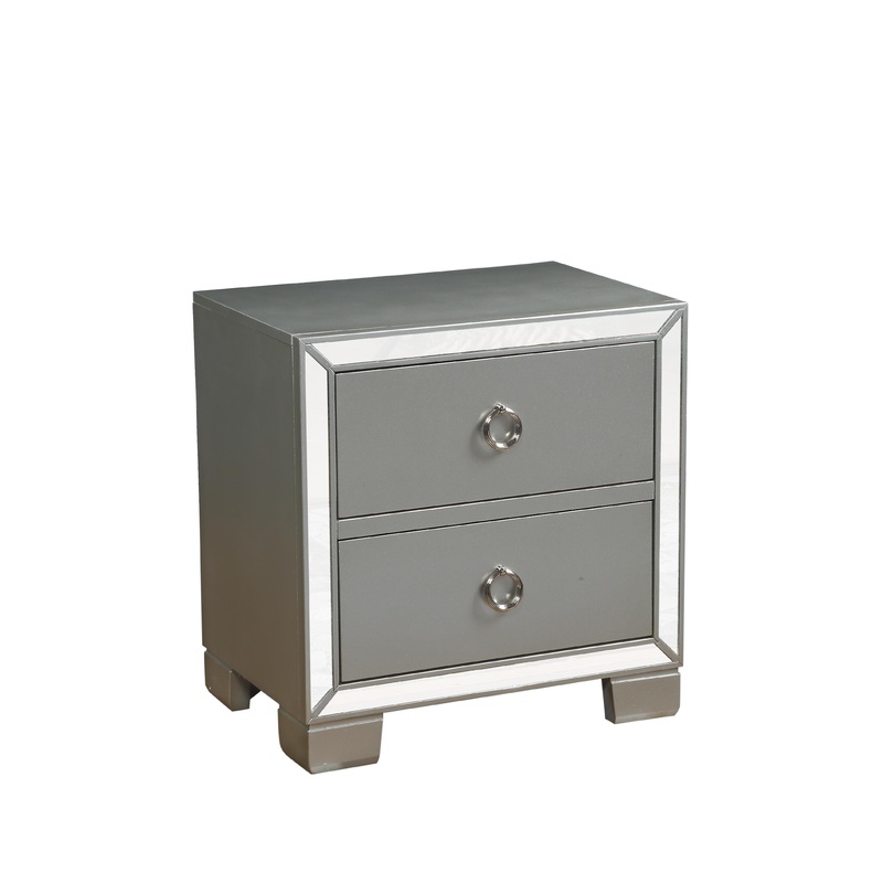 ACME Voeville II Nightstand, Platinum, 22" x 15" x 23"H, 33lbs. Features: - Casegood Drawer: Glide Center Metal, Dovetail French Back Only, Felt-Lined Not Included - Mirror NOT Beveled - Collection: Padded HB 24830Q, Wooden HB 24840Q - No Nailhead Trim Mat