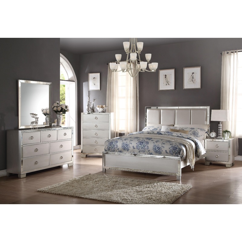 ACME Voeville II Eastern King Bed (Padded HB), Platinum PU & Platinum (1Set/3Ctn), 86" x 79" x 51"H, 102lbs. The Voeville II Collection will create a warmer and fresher environment in your master bedroom with its platinum finish. Features panel wooden head