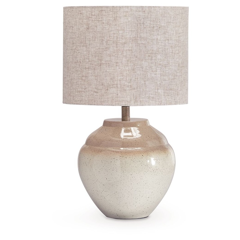 Less is moreand this table lamp proves it. Featuring a simple yet shapely metal base with an earthy cream and beige finish, its perfect for your relaxed retreat, whether thats a she shed, man cave or TV room.