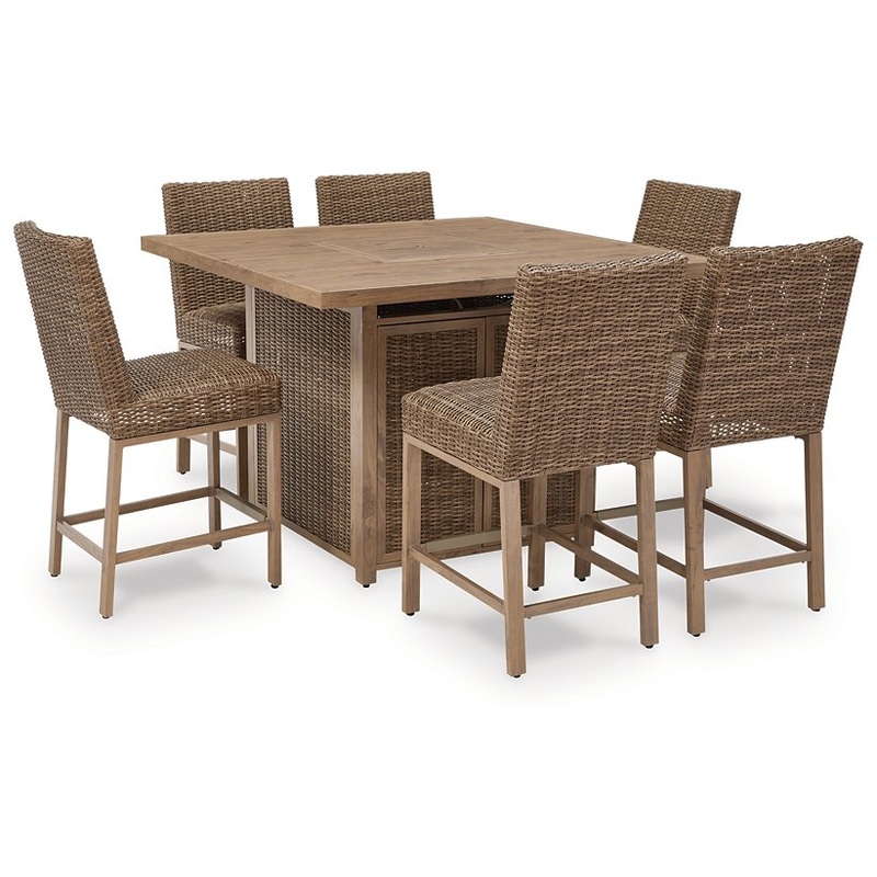 A perfect balance of design and utility, this fire pit entertaining set turns any outdoor living space into your own piece of paradise. Crafted with easy-care resin wicker over an aluminum frame with the look of wood, it's the epitome of California dreamin