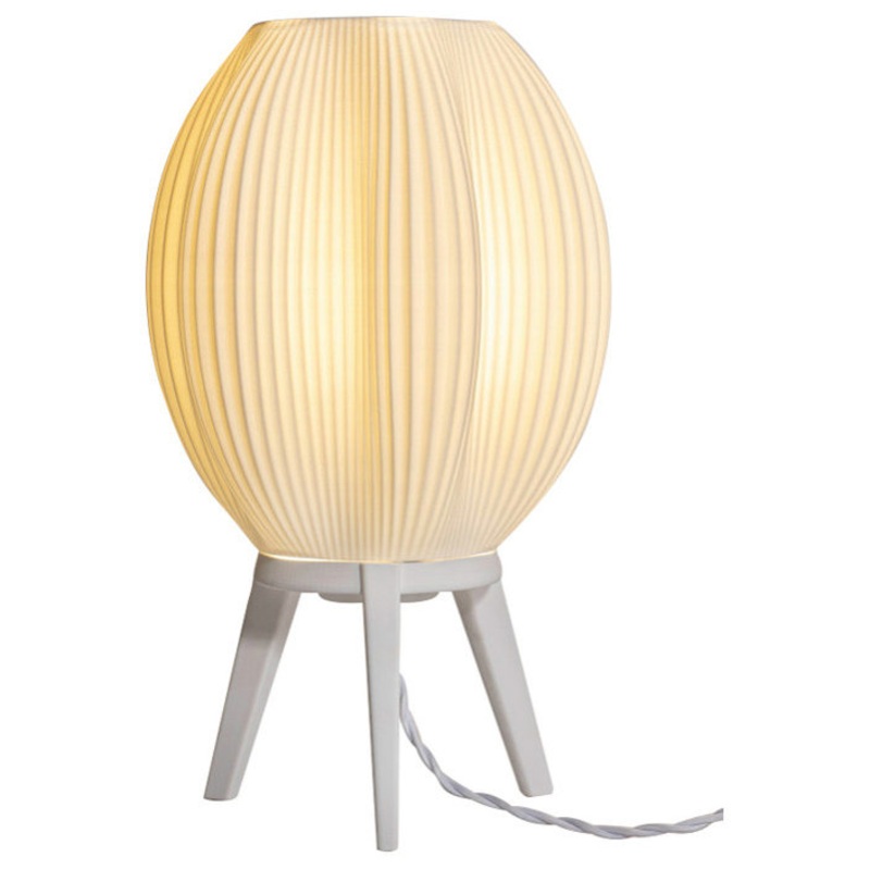 -Minimalist white three legged base is accentuated by a modern PLA filament white wavy shade