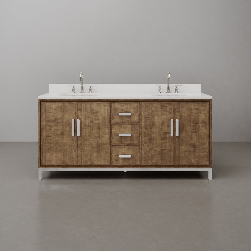 Refine your contemporary bathroom with the sophisticated Westin collection, featuring the 72-inch bathroom vanity in Lustrous Walnut. This stylish free-standing vanity is adorned with a 1-inch-thick Whitebrook quartz countertop and matching 4-inch-high backsplash, complete with pre-drilled 8-inch-wide faucet holes for easy installation of your choice of bathroom faucet. The double undermounted ceramic sinks, along with soft-closing doors and drawers with two levels of cabinet shelf storage space, ensure a luxurious experience while maintaining top-of-the-line functionality and usability. Whether you’re planning a new build, renovation, or remodel, the Westin collection’s contemporary design styling is guaranteed to elevate your next bathroom project. Vanity comes fully assembled for easy installation. Matching vanity mirror and bathroom faucets are available as options.