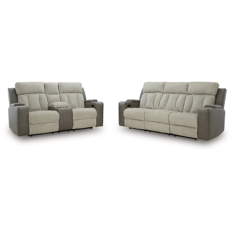 Refined relaxation, reimagined for the modern home. This power reclining seating package combines premium comfort with smart features like built-in storage arms, USB charging and cup holders. One-touch reclining and adjustable headrests let you find your perfect position, while luxurious heat and massage functions melt away the day’s stress. And for an added dose of style, it’s wrapped in a two-tone upholstery that pairs soft textured fabric with coordinating faux leather.