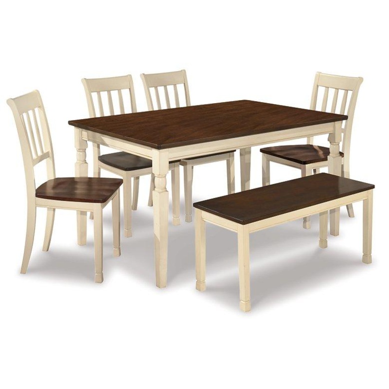 Incorporate cottage-cool warmth in your dining space with this dining room set. Its two-tone finish serves up twice the charm and character. Side chairs are in a classic rake back design. The bench is straight out of a country cottage. Its unique two-tone