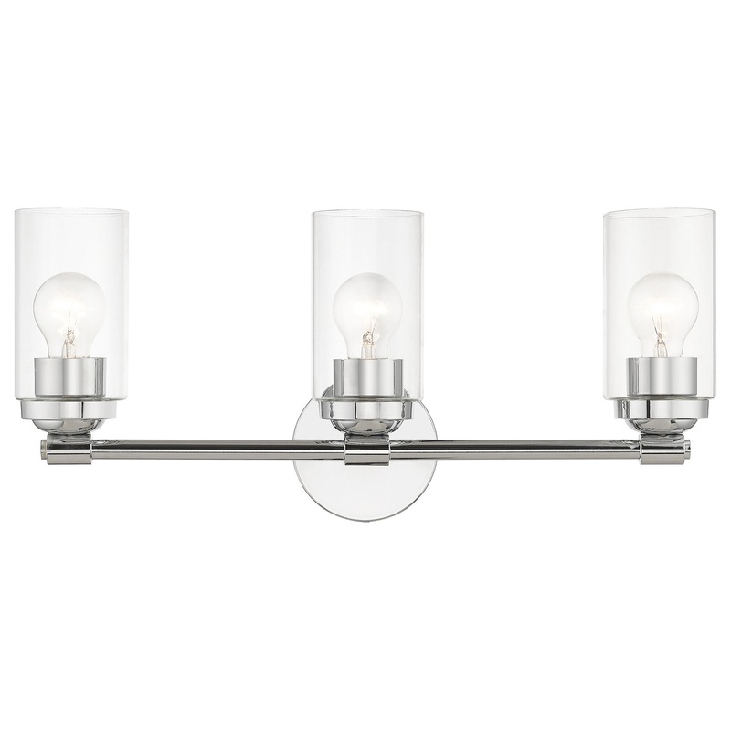 Illuminate your home with a bright design from the Whittier collection. This three-light vanity sconce features a polished chrome finish with clear glass. Perfect for a contemporary or transitional luxury bathroom setting. -Number of Bulbs: 3 -Type of Bulb