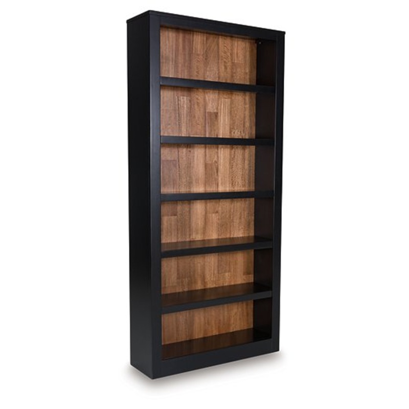 Raise the bar on modern farmhouse style with this home office bookcase. Its casual good looks are accentuated with a two-tone finish, which pairs a warm satin black with a butcher block veneer back in a contrasting rich brown wood tone. Six shelvesfour of