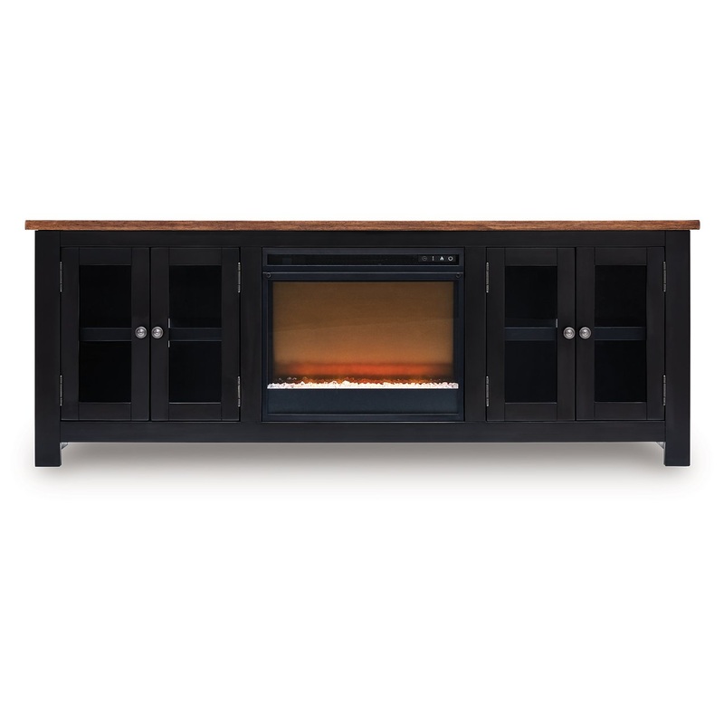 Raise the bar on modern farmhouse style with this TV stand with electric fireplace. Its sturdy silhouette and casual good looks are accentuated with a two-tone finish, which pairs a warm satin black base with a contrasting butcher block veneer top. Glass door cabinets with adjustable shelves offer plenty of storage for media and electronics. Adding that much more show-stopping style, the electric fireplace insert operates with or without heat and includes a six-level temperature setting, a remote control and an overheating control for added safety. It comes with faux glass crystals and natural stones, so you can customize the look of the flame bed.