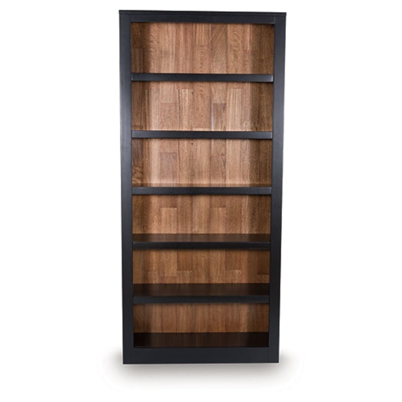 Raise the bar on modern farmhouse style with this home office bookcase. Its casual good looks are accentuated with a two-tone finish, which pairs a warm satin black with a butcher block veneer back in a contrasting rich brown wood tone. Six shelvesfour of which are adjustable to fit your needsare perfect for storage and displaying decor, bringing both form and function to your office.