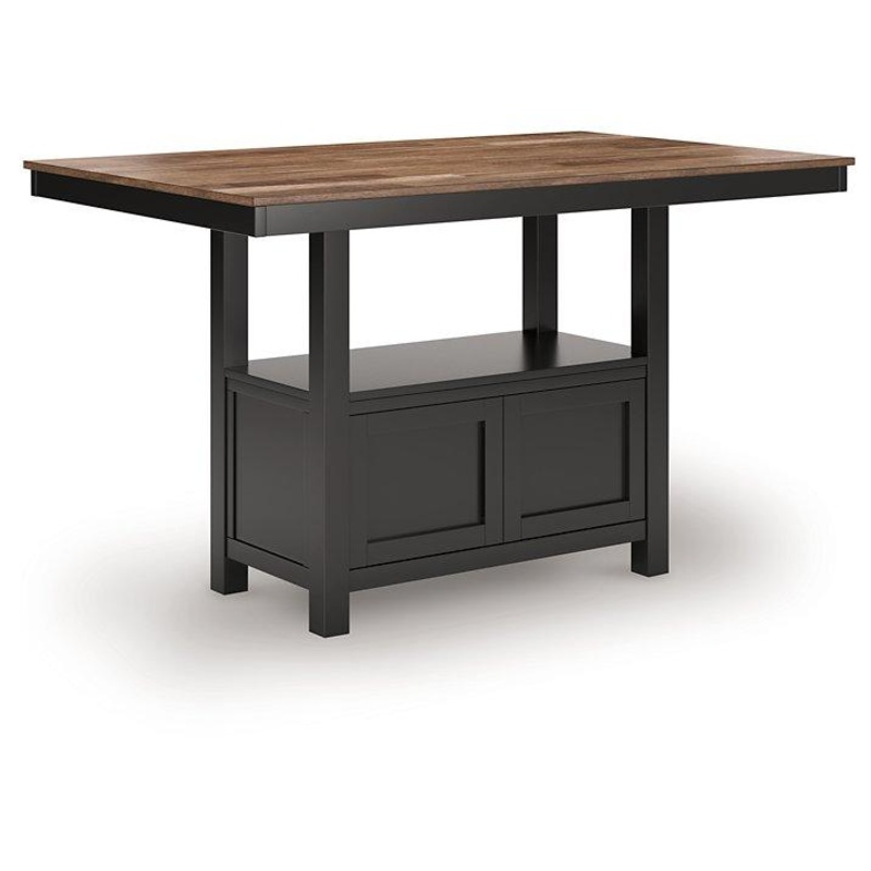This counter height dining table dresses up your favorite farmhouse motifs with modern flair. A butcherblock-style top provides ruggedly chic contrast to the sleek black base. Short on storage space? The pedestals built-in cabinet, with doors on each side for easy access, keeps essentials within reach.