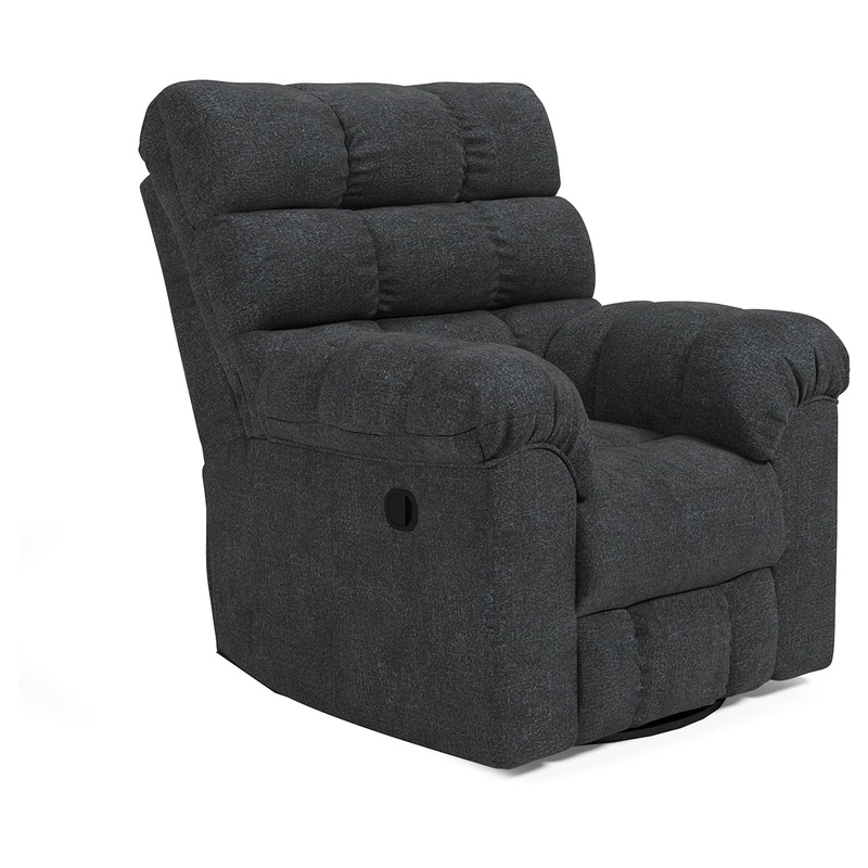 Take ultimate comfort and style for a spin with this swivel rocker recliner in soothing blue-gray. Covered in a feel-good fabric beautified with puckered stitching and biscuit-back tufting, this quality recliner is set on a sturdy swivel, so youll always b