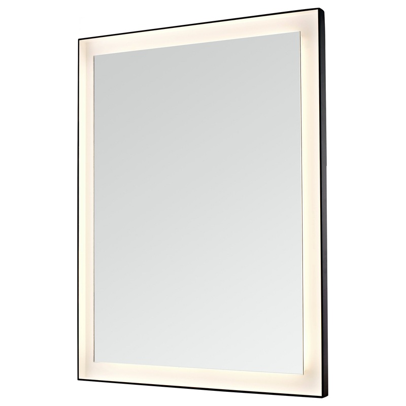 Wall-mounted rectangular LED mirror that lights via external switch (not included) connected to electrical power source. Frame is black metal edged on the outside with white recessed inside into which light shines. Available in widths of 16\Model # (MPN)50