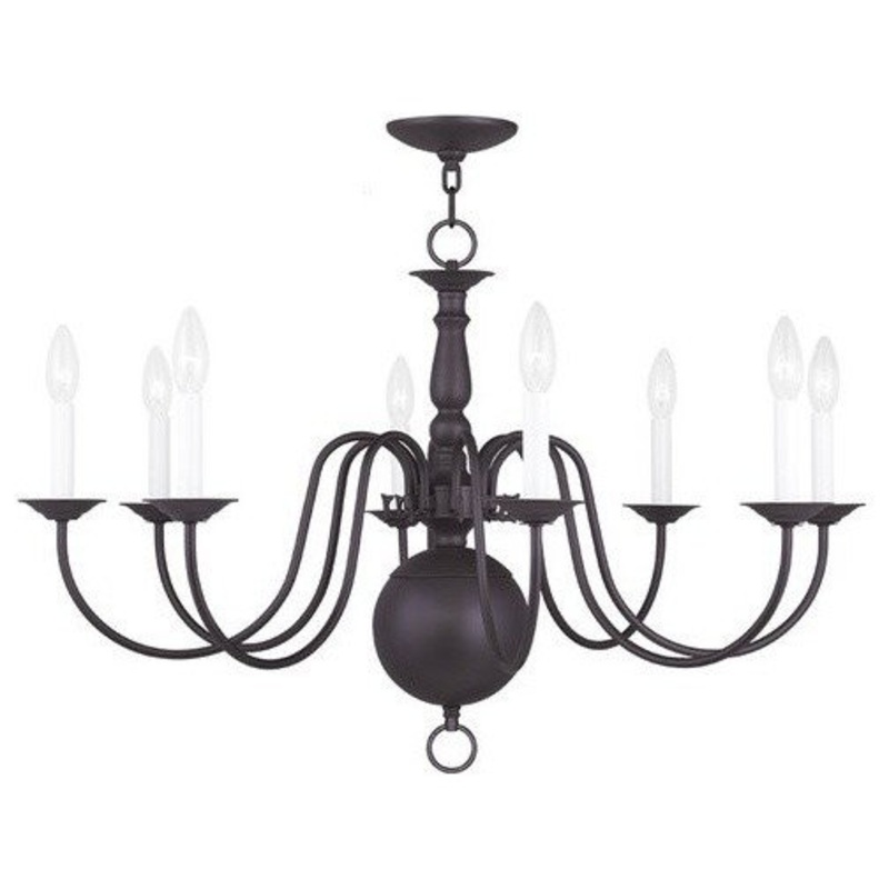 Simple, yet refined, the traditional, colonial chandelier is a perennial favorite. Part of the Williamsburgh series, this handsome chandelier is a timeless beauty. -Finish: Bronze -Material: Steel -Number of Bulbs: 8 -Bulb Base Type: Candelabra Base -Max W
