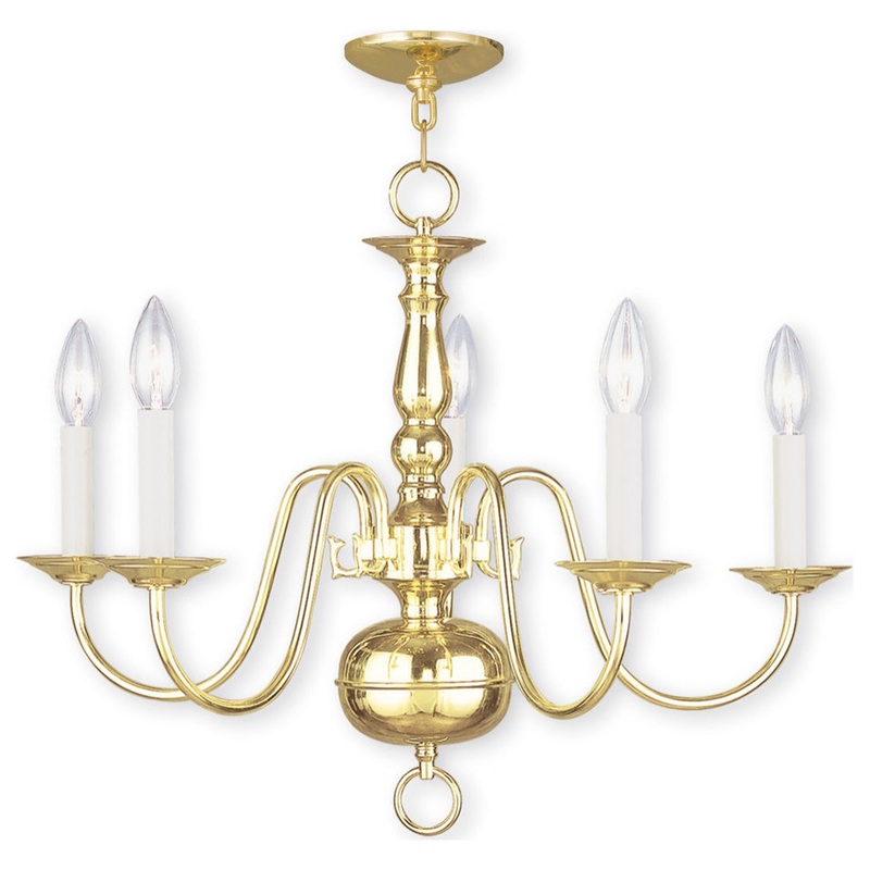 Simple, yet refined, the traditional, colonial chandelier is a perennial favorite. Part of the Williamsburgh series, this handsome chandelier is a timeless beauty. -Finish: Polished Brass -Material: Steel -Number of Bulbs: 5 -Bulb Base Type: Candelabra Bas