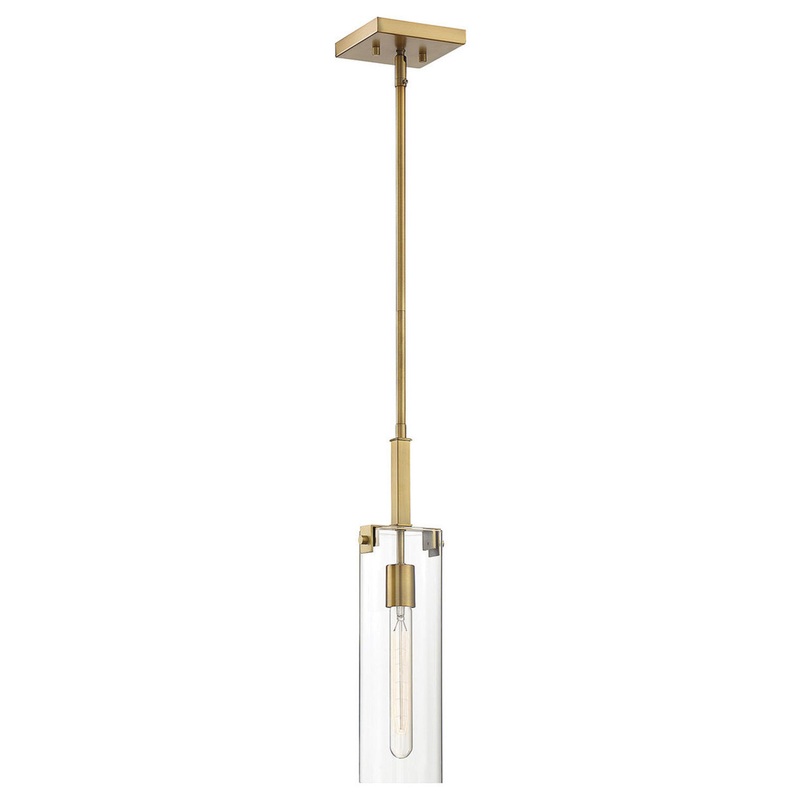 This Savoy House Winfield 1-Light Mini Pendant showcases a bold, slim look with a shade of clear glass, thoughtful minimal detailing and a warm brass finish. -Bulb type: E -Number of bulbs: 1 -Bulbs included: No -UL listed: UL, CUL -Bulb wattage: 60W -Fini