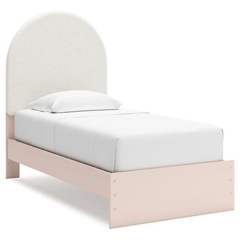 Pretty in pink. This twin upholstered panel bed keeps the spirit of your homes modern aesthetic while suiting all your young ones needs. Its cozy-cute upholstery and subtle blush finish bring a playful, charming vibe to bedtime. Made for her and styled for you, its a lovely addition to a beautifully chic childs bedroom.