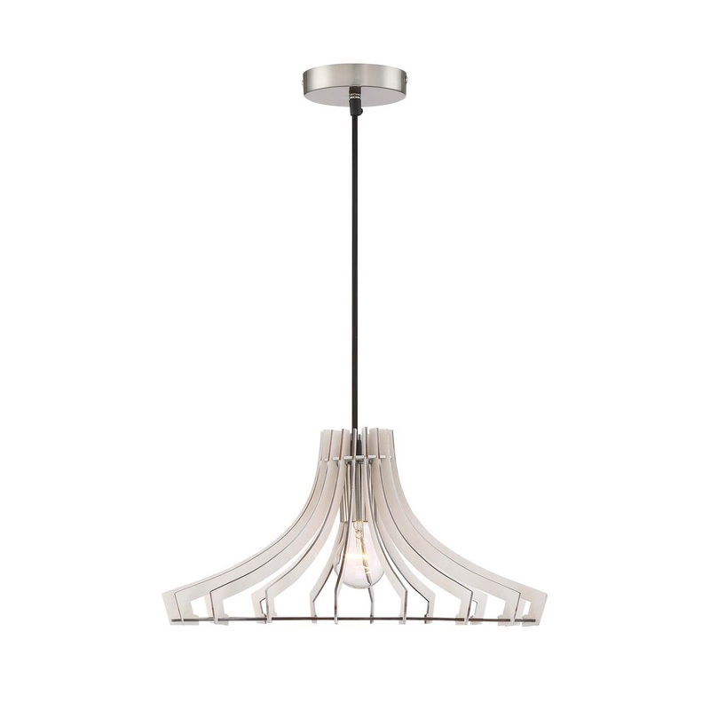 These Wood pendant lights showcase bare bulbs nestled within shapely shades made of white wood slatting. Slim hanging cords keep your attention on the wood. Arnsberg Lighting offers meticulous German engineering to beautify your home. Hardwired. Requires 1 E26 (100W) light bulb (not included).