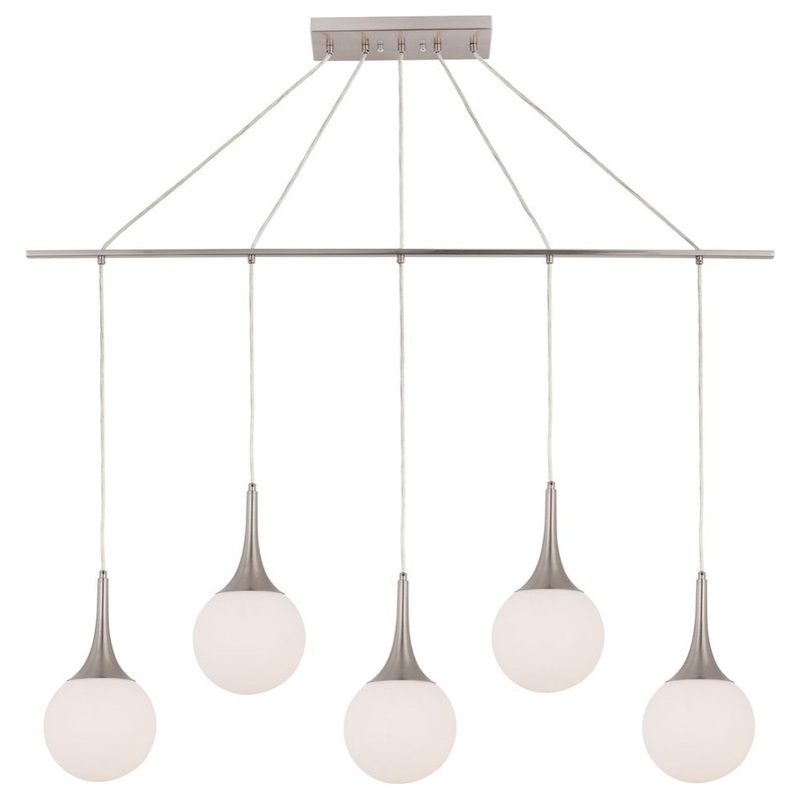 This linear pendant features sockets that easily flow into glass spheres arranged along a metal rod, creating an island of hanging fruit.