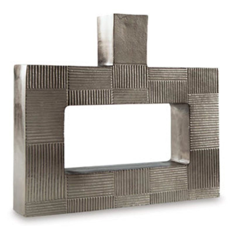 Stunning from all angles, this vase’s contemporary geometric form acts as a captivating focal point for your mantle or bookshelf. Its antiqued nickel-tone body is detailed with subtle texture for added visual appeal. What a perfect fit for those seeking forward-thinking style.