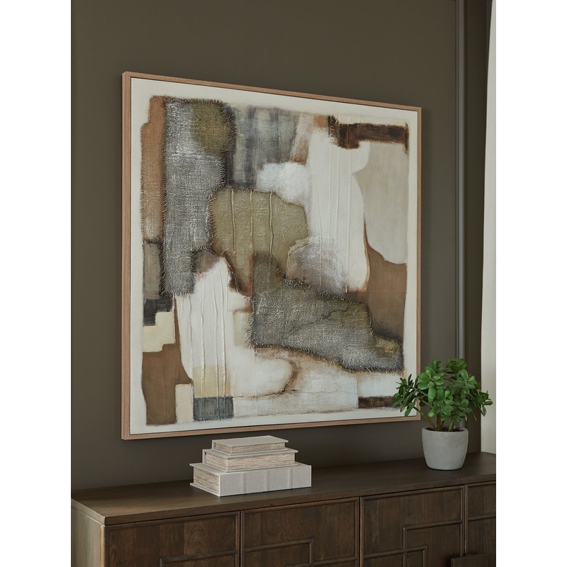 This wall art brings a fresh and comforting feel to modern spaces. Flowing brushstrokes in serene shades of tan, brown, gray, and ivory create an abstract design full of organic movement. Fabric embellishments are layered with hand painted details. And whe